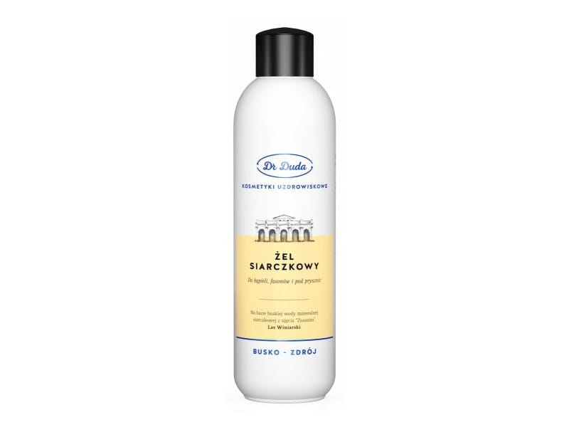 - Pod prysznic – dwie nakrętki żelu siarczkowego nanieść na mokrą skórę, po umyciu ciała spłukać ciepłą wodą.